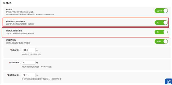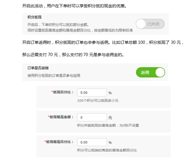 操作步驟:總部后臺→營銷→積分營銷→積分抵現:增加“積分抵現的訂單是否送積分”和“積分抵扣金額是否返傭”的開關。默認都是開啟的