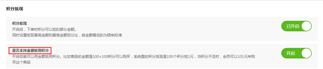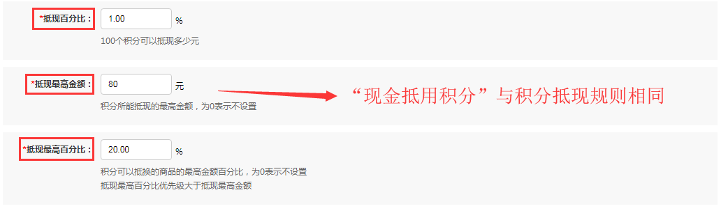 1.積分抵現開啟后,下單時積分可以抵扣部分金額。同時設置抵現最高金額和最高金額百分比,按金額最低的為限制標準。