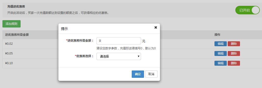 充值送優(yōu)惠券”可以設置多種規(guī)則,充值不同的金額可以送不同的優(yōu)惠券 比如我設置充值200元送50元優(yōu)惠券,我如果充300元,也是送50元優(yōu)惠券,有多種規(guī)則時不會疊加,只會匹配最高的充值金額。
