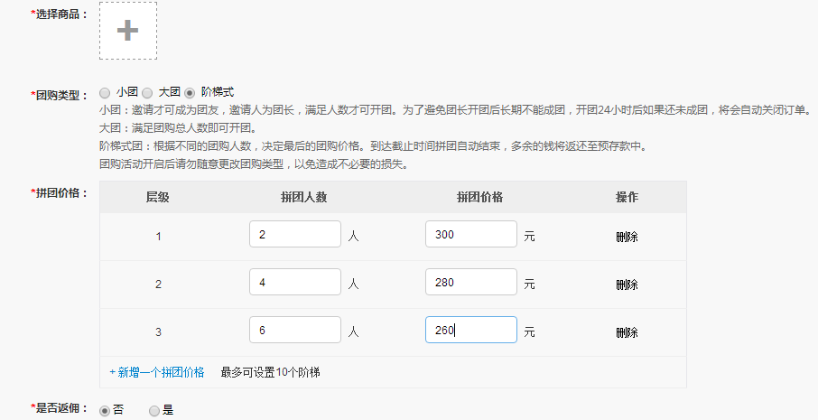 這里主要講下階梯式拼團(tuán):比如我這里設(shè)置了2人,4人,6人的階梯團(tuán),前兩個(gè)人購(gòu)買按照原價(jià),第3個(gè)人按上面設(shè)置的2人團(tuán),也就是必須大于設(shè)置的階梯團(tuán)人數(shù)方可享受對(duì)應(yīng)的團(tuán)購(gòu)價(jià),最后團(tuán)購(gòu)結(jié)束后,會(huì)根據(jù)總?cè)藬?shù)來(lái)定團(tuán)購(gòu)的價(jià)位,并在拼團(tuán)結(jié)束半個(gè)小時(shí)沒(méi)把差價(jià)返回到買家的賬戶余額中。