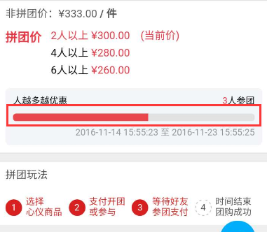 階梯式團(tuán):根據(jù)不同的團(tuán)購(gòu)人數(shù),決定最后的團(tuán)購(gòu)價(jià)格。到達(dá)截止時(shí)間拼團(tuán)自動(dòng)結(jié)束,多余的錢將返還至預(yù)存款中。團(tuán)購(gòu)活動(dòng)開(kāi)啟后請(qǐng)勿隨意更改團(tuán)購(gòu)類型,以免造成不必要的損失。