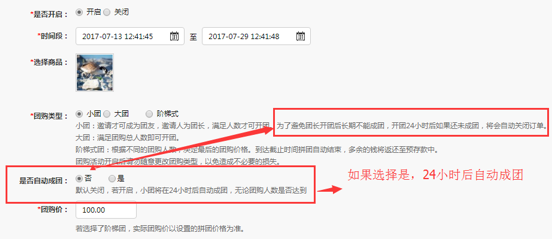 小團(tuán)可以設(shè)置開(kāi)團(tuán)24小時(shí)后是否自動(dòng)成團(tuán)