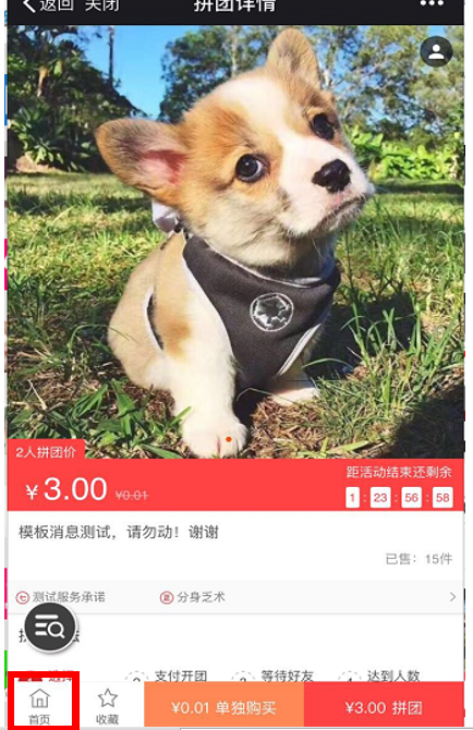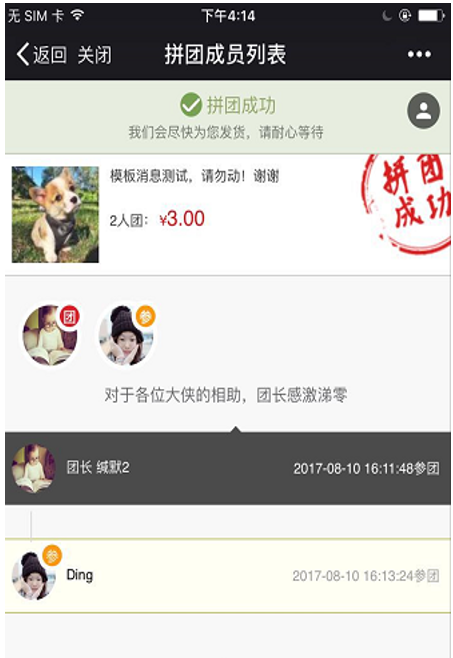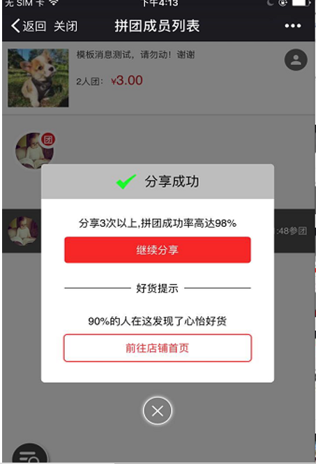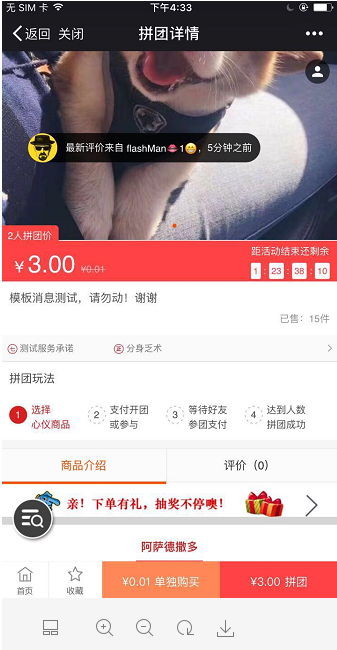 ① 點(diǎn)擊拼團(tuán)詳情頁(yè),最新訂單彈窗提醒顯示拼團(tuán)訂單
