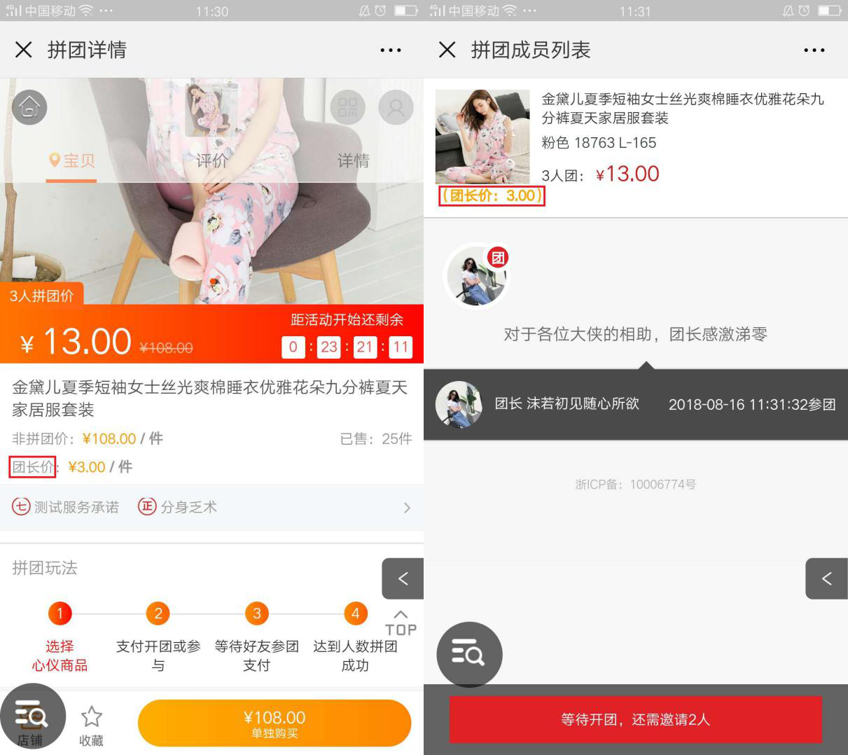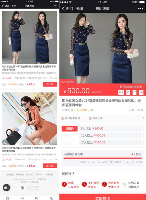小團(tuán):邀請(qǐng)才可成為團(tuán)友,邀請(qǐng)人為團(tuán)長(zhǎng),滿足人數(shù)才可開(kāi)團(tuán)。為了避免團(tuán)長(zhǎng)開(kāi)團(tuán)后長(zhǎng)期不能成團(tuán),開(kāi)團(tuán)24小時(shí)后如果還未成團(tuán),將會(huì)自動(dòng)關(guān)閉訂單。小團(tuán)可以設(shè)置團(tuán)長(zhǎng)是否免單,選擇允許,那團(tuán)長(zhǎng)下單時(shí)支付0元就參團(tuán)成功。小團(tuán)也可以在活動(dòng)詳情頁(yè)面參與別人的團(tuán)(針對(duì)小團(tuán),只會(huì)顯示與該團(tuán)相關(guān)的最早的2個(gè)團(tuán),拼團(tuán)成功后就不會(huì)顯示了)。