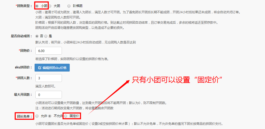 小團(tuán)可以設(shè)置團(tuán)長(zhǎng)價(jià)(固定價(jià)),設(shè)置0或空按拼團(tuán)價(jià)來(lái)計(jì)算。供應(yīng)商后臺(tái)與總部后臺(tái)拼團(tuán)規(guī)則相同