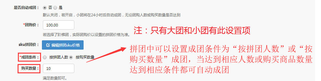 拼團(tuán)活動(dòng)可以設(shè)置是按“拼團(tuán)人數(shù)”還是按“購(gòu)買數(shù)量”來(lái)判斷是否達(dá)成成團(tuán)條件