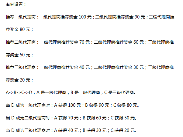 總部后臺→會員→代理商:代理商推薦獎,增加“只有直接代理商能拿推薦獎”的開關,開啟后,只有直接代理商能拿推薦獎,間接代理商拿不到推薦獎。 關系:A→B->C->D,A是一級代理商,B是二級代理商,C是三級代理商 D是會員 當D成為代理商之后,只有C(直接代理商)能拿推薦獎,A,B拿不到推薦獎。