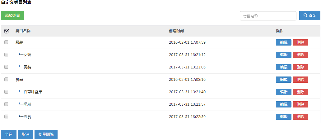 點擊“自定義類目”進行添加新類目。可添加一級分類、二級分類。 返回類目列表,可直接點擊“編輯”按鈕進行編輯。