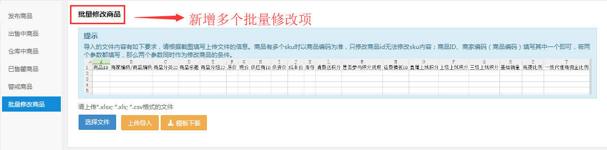 商品批量修改,增加多個修改項:商品ID、商品分類ID、商品標題、商品分組ID、商品原價、商品現價、供應商ID、供貨價、成本價、商品數量、消費送積分、是否參與積分抵現、運費模板、商家編碼、直屬上線積分、上級上線積分、三級上線積分、基礎銷量。