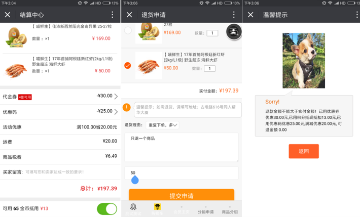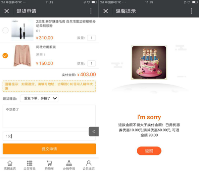 ·訂單有參與優惠后,商品不能全額退款時,提示優惠了多少,可退多少