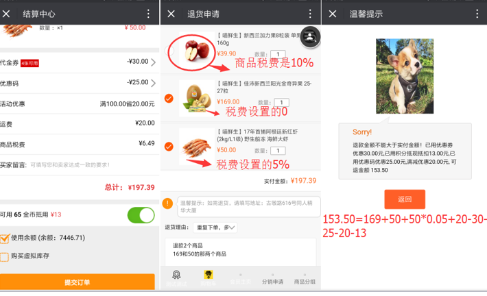 ·· 一個訂單中多個商品:只退部分商品的話(商品的價格+商品稅費+運費)-參與的優惠(積分抵現的/優惠券/優惠碼/滿減)=實際退的金額。
