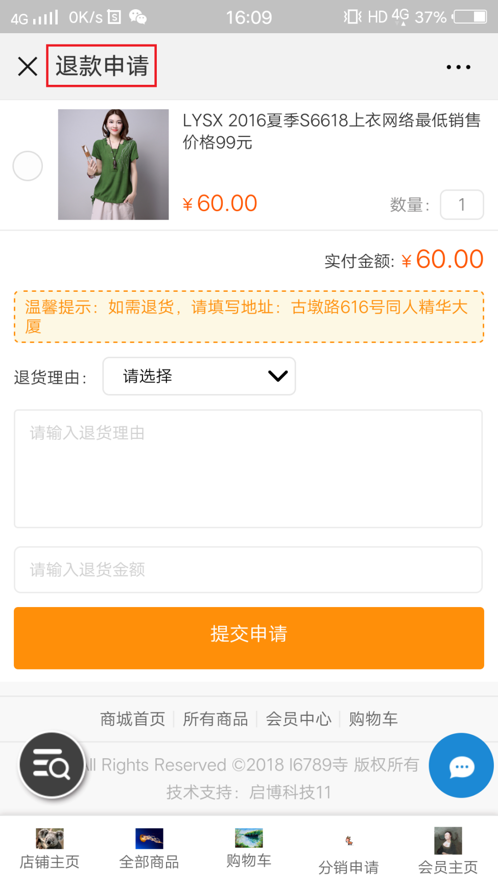 手機端購買商品申請退款(商品未發貨的情況下),進入“退款申請”頁面: