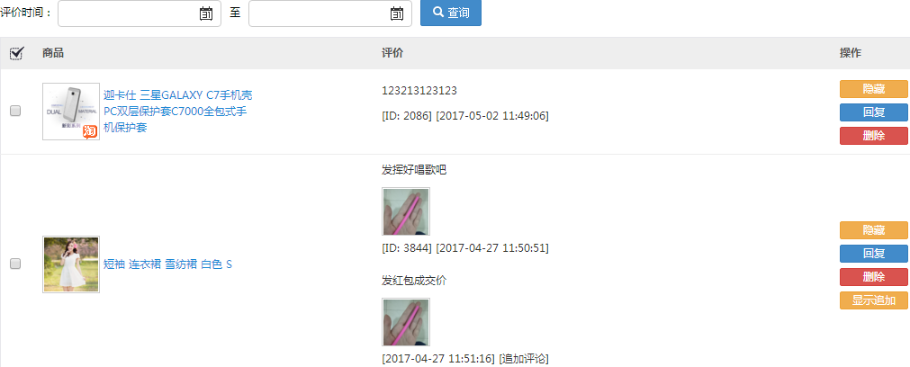 ·用戶可以在商品評價中查看相關訂單的評價,對于差評用戶可以點擊“隱藏”按鈕進行隱藏。隱藏后僅評價方自己能看到,其它人均看不到。對于回復的內容可以點擊“刪除”按鈕進行刪除。