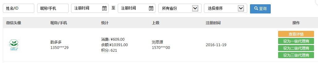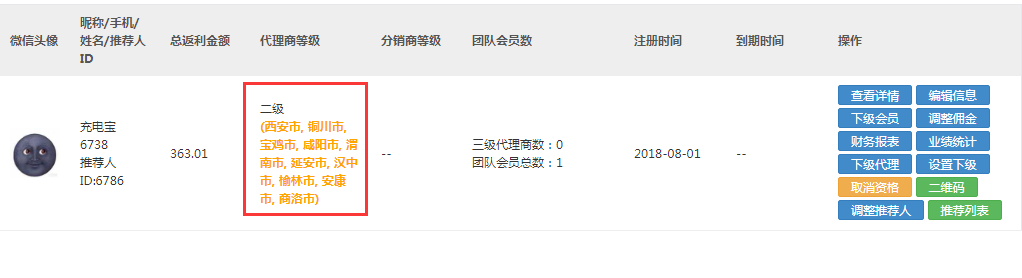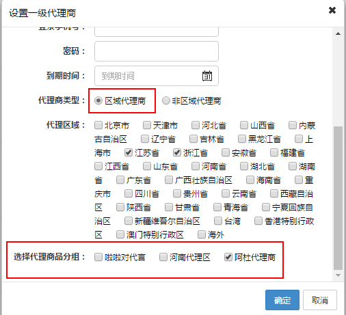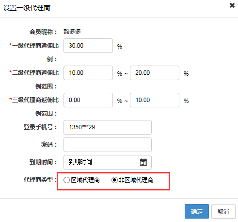 設置代理商:可以設置會員為什么等級的代理商,點擊“設為一級代理”按鈕,彈出設置框進行設置。設置好代理商的返傭比例,手機號,密碼,到期時間,代理類型,確定即可。 這里應注意一下“代理商類型”如果是要分區域的代理,請選擇區域代理商,勾選相對應的省市即可。
