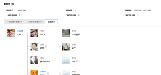 ① 下級分銷商數:代理商下面的所有分銷商(也是根據代理關系統計的,同級別的過濾掉); ② 下級買家管理:會員下級(代理關系范圍內)包括所有的“下級分銷商”、“下級會員”、“下級代理商”、“下級訂貨商”、“下級門店”和“下級員工”; ③ 圖標展示:一級下級最多顯示10個人,這10個下級可以查看各自的10個一級下級,就這樣一直循環直到顯示完整條線上的所有會員。