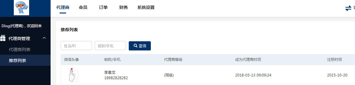 ·其中推薦列表中可以查詢到某個代理商團隊里發展的同等級代理商人數和直推代理商人數