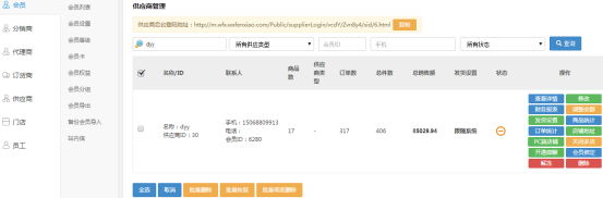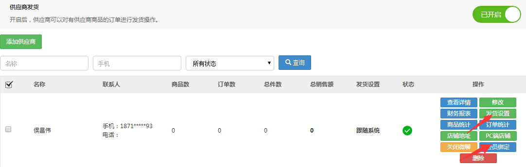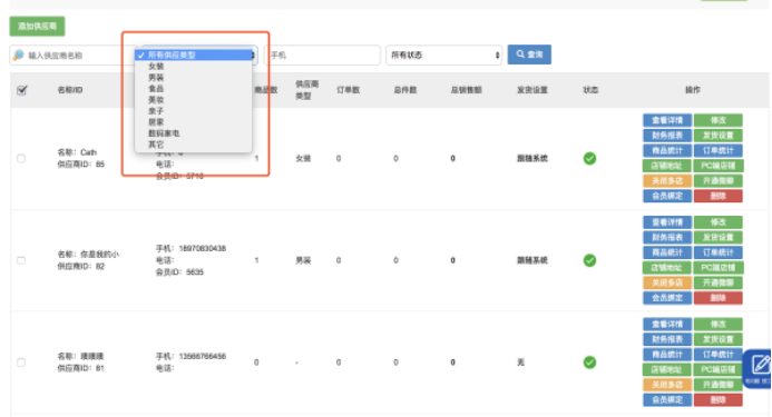 供應商列表中,可以查看此供應商的詳情、商品統計、訂單統計、財務報表、發貨設置等。