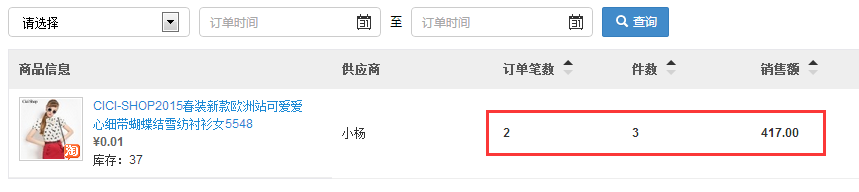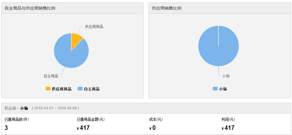 商品統計:點擊進入商品統計,可以查看每個商品的供應商、訂單數、銷售額等。