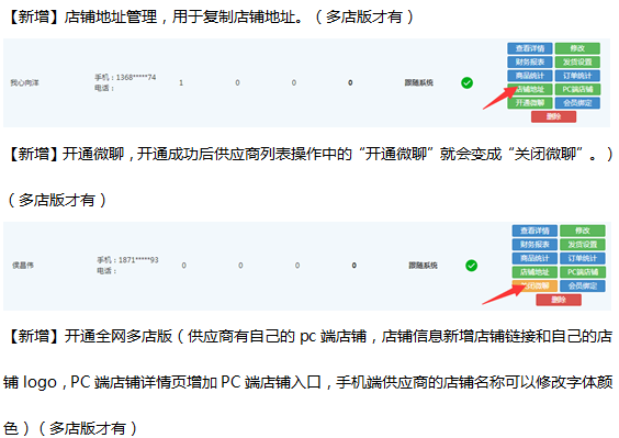 操作步驟: 總部后臺→供應商→供應商管理:供應商列表“操作”項增加“開通多店”的功能,默認是開啟的,商家也可以關閉多店。