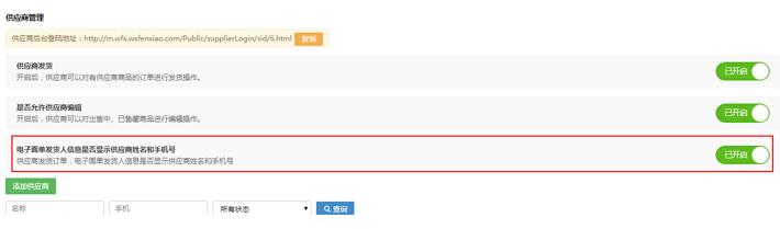 操作步驟:總部后臺→供應商:增加“電子面單發貨人信息是否顯示供應商姓名和手機號”的開關,供應商發貨訂單,電子面單發貨人信息顯示供應商姓名和手機號。