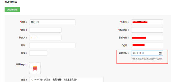 注意:供應商申請時沒設置默認到期時間,想要設置到期時間,必須通過總部來修改和添加到期時間,為空則沒到期時間。