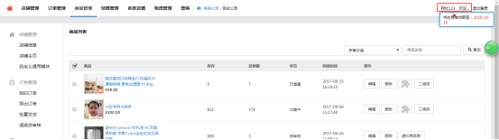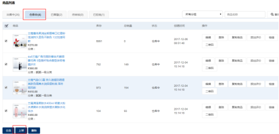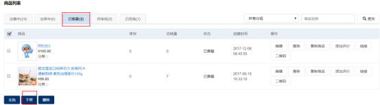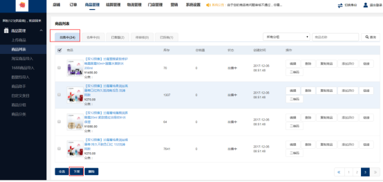 操作步驟: 供應商后臺→商品管理→商品列表:供應商對其出售中和已售罄的商品可以批量設置下架,可以設置倉庫中的商品批量上架。
