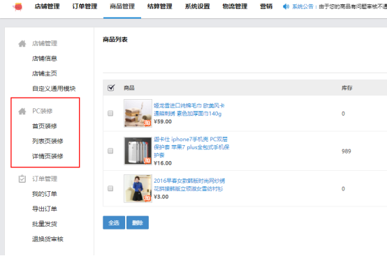 操作步驟: 供應商后臺:增加“PC裝修”的功能。主要包括“首頁裝修”、“列表頁裝修”和“詳情頁裝修”。
