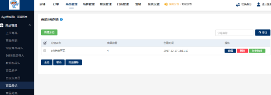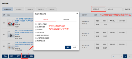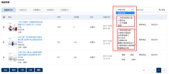 供應商后臺→商品→商品管理→商品列表:針對不同狀態的商品,供應商可以批量設置商品分組,可以同時選擇總部的分組和自己的分組。