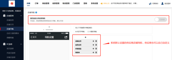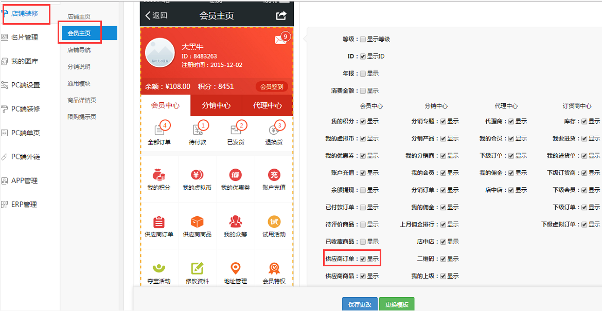 ②總部后臺→店鋪→店鋪管理→會員主頁:會員中心裝修可以設置是否顯示“供應商商品”的菜單項;