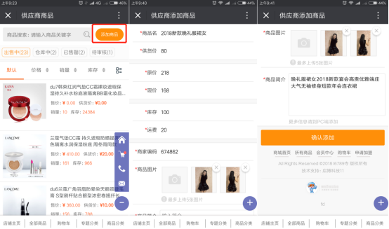 ④頁面中有“添加商品”的按鈕,點擊后進入添加商品頁面,有以下表單項:商品名、供貨價、原價、現價、庫存、商品圖片(最多5張)、商家編碼、商品簡介(只允許輸入文字);手機端供應商發布商品,增加重量,體積選項(選填),商家編碼;增加重量、體積(選項)和商家編碼(選填)。運費設置可選擇運費模板。