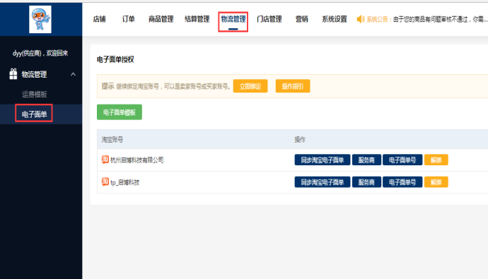 操作步驟:供應商后臺→電子面單:1、授權電子面單綁定淘寶賬號;2、編輯電子面單模板或同步淘寶電子面單。