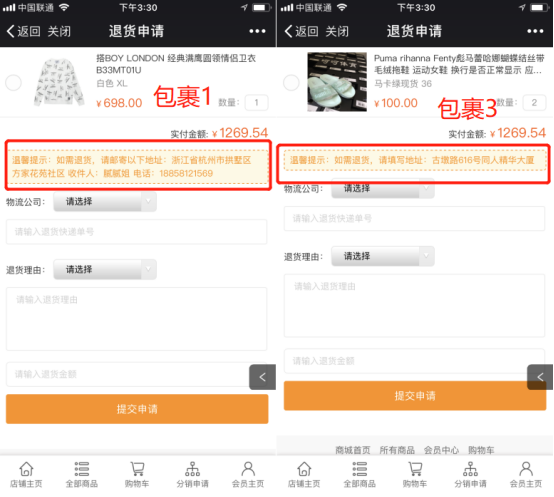 下面的邏輯全都發生在供應商已發貨的情況下(未發貨狀態下顯示總部退換貨說明): 用戶手機端訂單列表:訂單狀態是已發貨的狀態(退換貨按鈕顯示在訂單詳情) ① 若訂單中有一個或者多個供應商發貨商品,點擊到退貨頁顯示對應供應商的退換貨說明,沒設就顯示總部的設置 ② 若訂單中無供應商發貨商品,點擊到退貨頁顯示總部退換貨說明 ③ 若訂單中有供應商和總部的商品,點擊到退換貨頁各顯示各的
