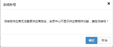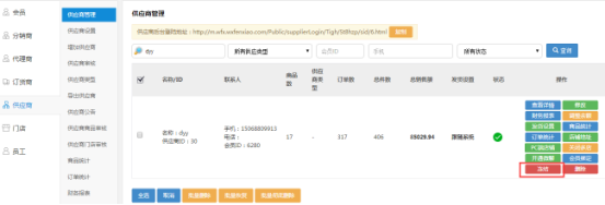 操作步驟: 總部后臺→會員→供應商→供應商管理:可以對供應商賬號進行“凍結”和“解凍”的操作。凍結后,供應商無法登錄供應商后臺、會員中心不顯示供應商相關功能