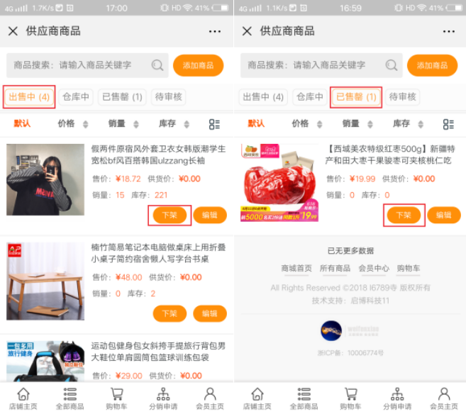 操作步驟: 微分銷手機端→會員中心→供應商商品:“出售中”和“已售罄”商品增加下架操作;“出售中”和“已售罄”的商品下架后,直接到“倉庫中”。