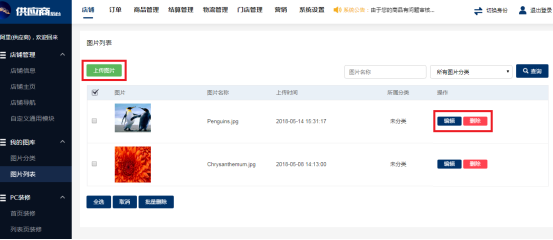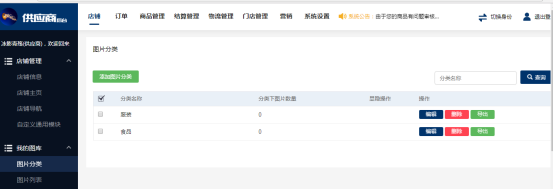 供應商后臺→店鋪→我的圖庫:“我的圖庫”包括“圖片分類”和“圖片列表”兩個功能。其中,“圖片分類”中可以進行添加、編輯、刪除、導出及查詢等操作。