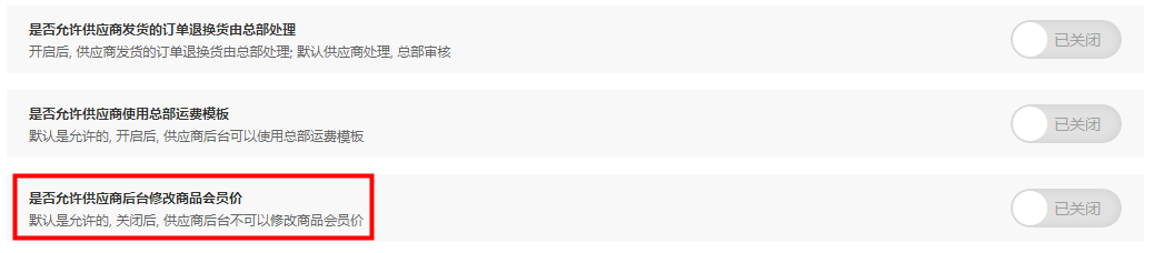 增加配置項“是否允許供應商后臺修改商品會員價”,默認是允許的,關閉后,供應商后臺不可以修改商品會員價。