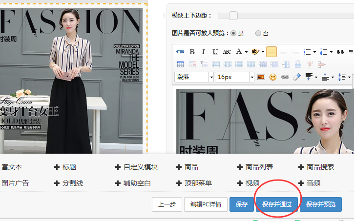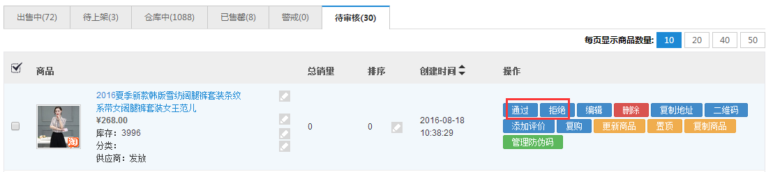 點(diǎn)擊”供應(yīng)商商品審核“可對(duì)商品進(jìn)行審核。也可以通過編輯商品時(shí),點(diǎn)擊保存并通過按鈕來審核,如下圖: