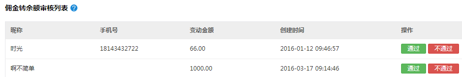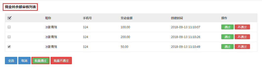 傭金轉(zhuǎn)余額申請(qǐng)支持批量審核,可以選擇“批量通過”或“批量不通過”