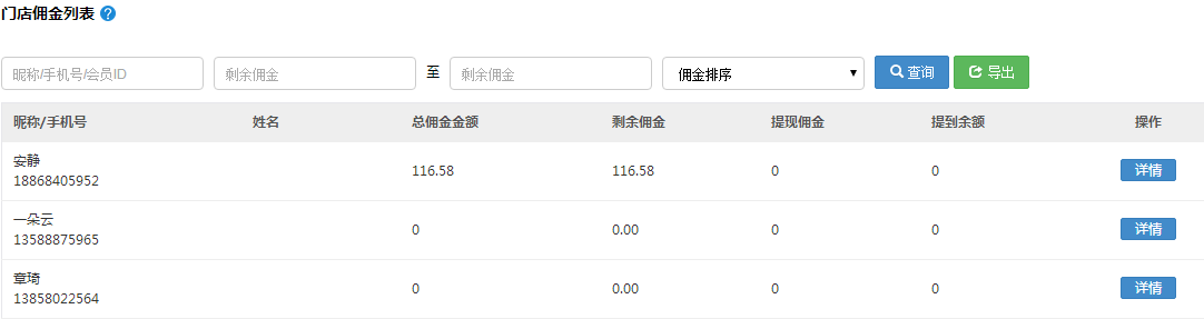 可以看到所有門店的一個傭金狀態,根據昵稱/手機號/會員ID,剩余傭金,進行查詢、導出,可以根據傭金的降序和升序進行排序,可以點擊詳情查看當前用戶的個人信息。