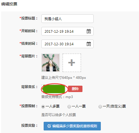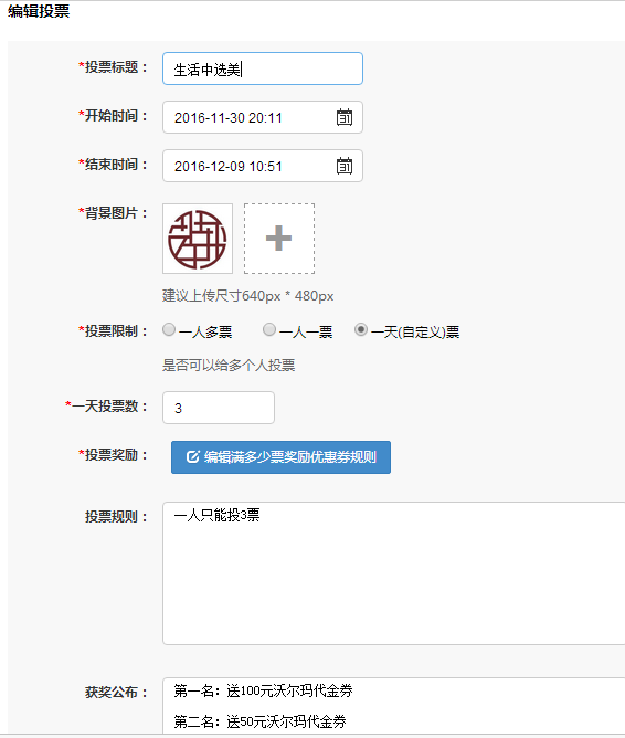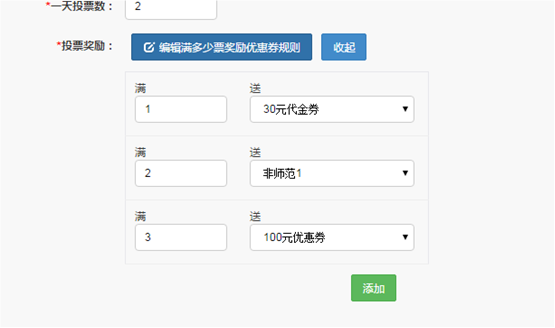 投票活動的限制增加“一天(自定義)票”,表示一個人每天可以投(自定義)票 投票活動可以設置滿多少票后獎勵哪張優惠券,鼓勵參與者(報名者)去拉票 這個投票獎勵是給報名人的,鼓勵選手拉票的,只有當投票活動關閉或者結束了之后才會送,刪除活動不會送。