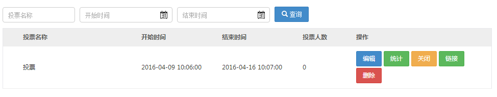 這個投票獎勵是給報名人的,鼓勵選手拉票的。比如設置滿50,送30元代金券,滿100送100元代金券。當報名人的被投票數滿50時,送30元代金券,滿100時,送100元優惠券。只會送一張不會說是疊加送的,達到相應的條件才會送相應的優惠券。只有當投票活動關閉或者結束了之后才會送,刪除活動不會送。 活動設置完成保存,系統會自動跳轉到列表頁。在列表頁我們可以在操作區對此活動進行相關的管理。如下圖所示: