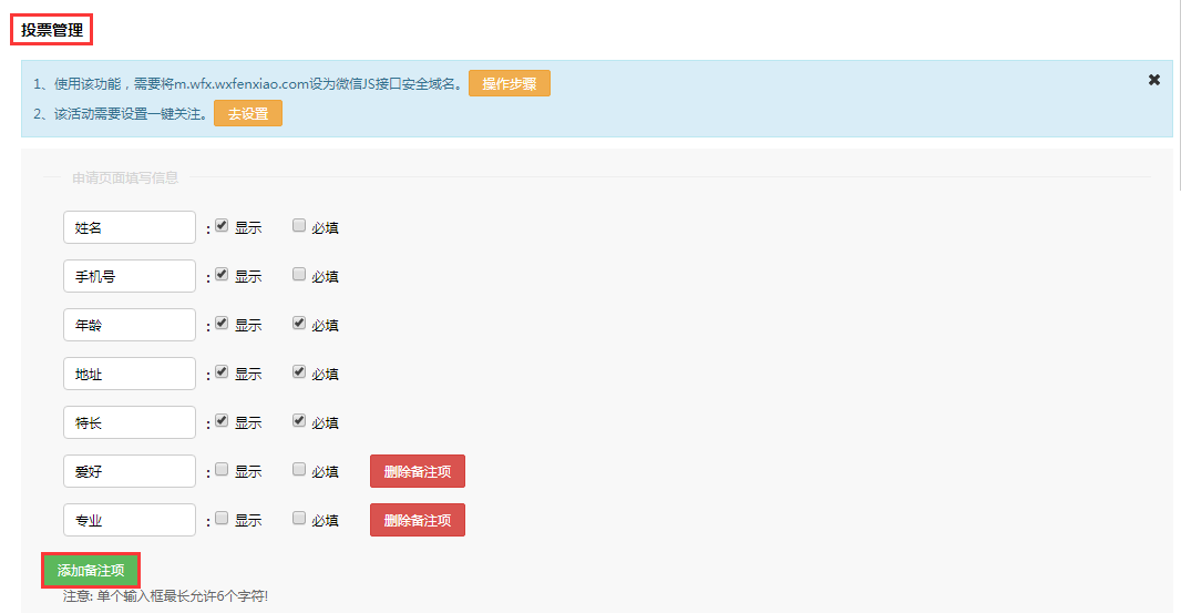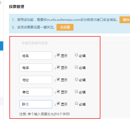 投票活動申請項可以設置自定義內容,可以根據需要添加需要在手機端顯示的內容