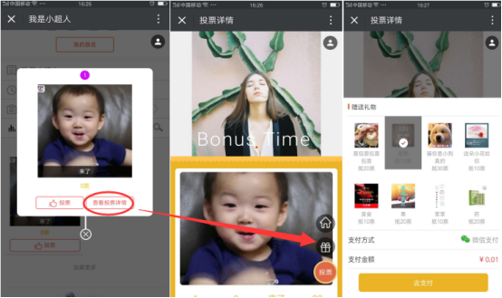 點擊查看投票詳情,點擊禮物,選擇要贈送的禮物,查看投票統計可以查看到投票的信息和禮物詳情。