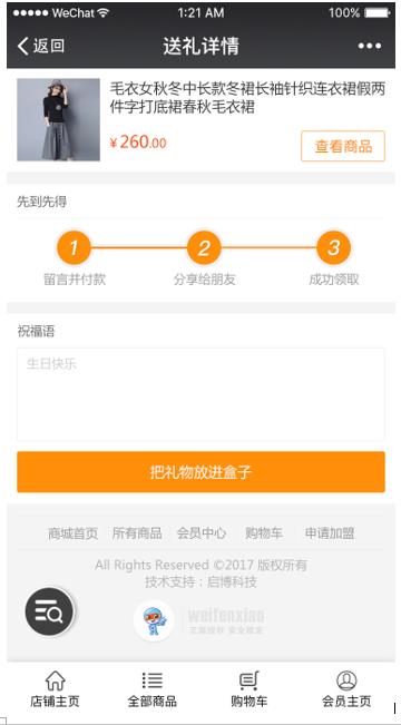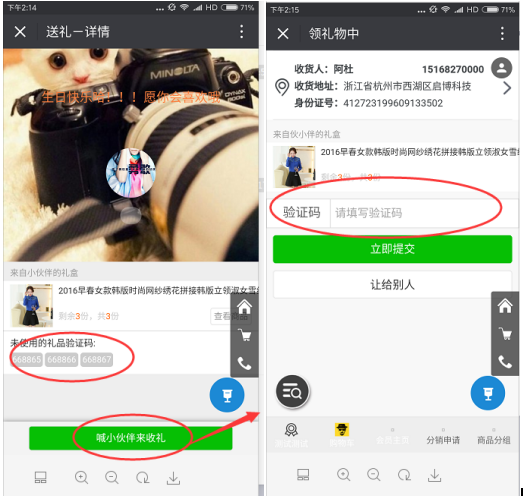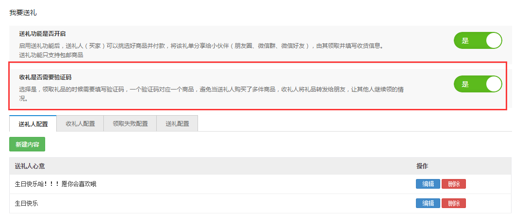 開啟送禮是否需要驗證碼: 選擇是,領取禮品的時候需要填寫驗證碼,一個驗證碼對應一個商品,避免當送禮人購買了多件商品,收禮人將禮品轉發給朋友,讓其他人繼續領的情況。