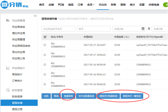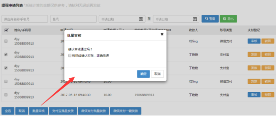 可單個審核,也可以批量審核,審核之后,也可選擇批量發放,我們支持支付寶批量發放、微信支付批量發放和微信支付一鍵發放。