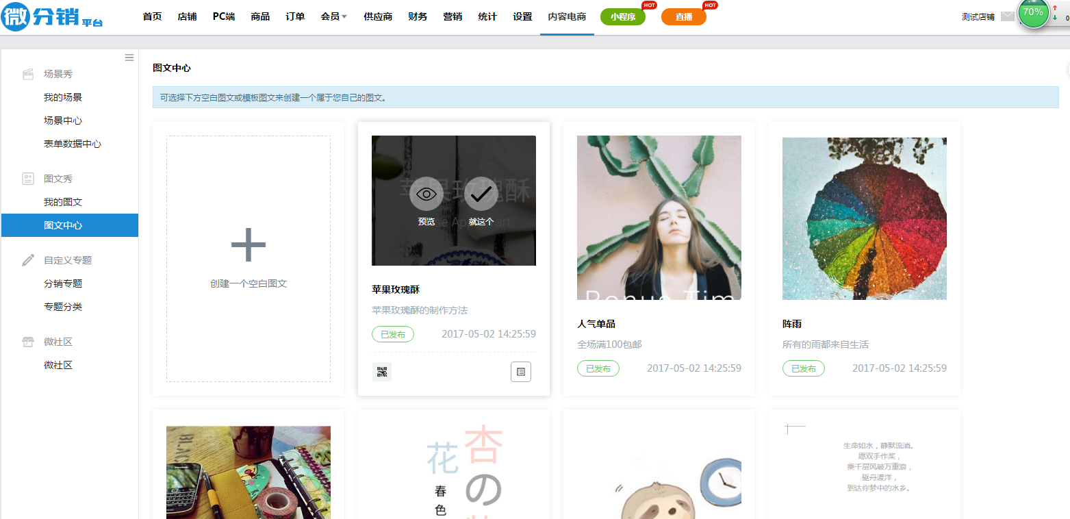 圖文中心:有很多個(gè)圖文,可選擇空白場(chǎng)景或模板場(chǎng)景來(lái)創(chuàng)建一個(gè)屬于您自己的圖文。