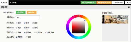 點擊“首頁裝修”進入到裝修頁面。 首先,背景設置,主要是設置頁面的背景顏色與背景圖片。具體操作請對照操作界面進行。如下圖所示: