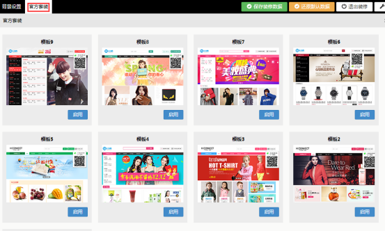 點擊“官方套裝”進入到系統默認的模板選擇頁面。用戶根據自身需求選擇,點擊“啟用”。