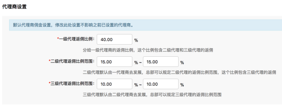 商家根據自身要求,設置代理商的返傭比例。(注:修改此處設置不影響之前已設置的代理商)。