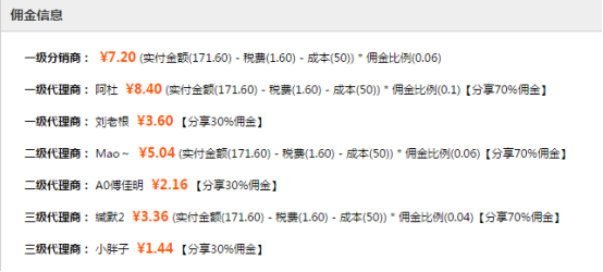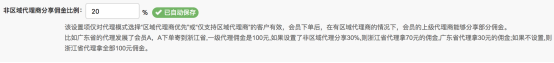 注:會員下單后,在沒有區域代理商的情況下,即便設置了“非區域代理商分享傭金比例”,會員的上級代理商也拿全部的傭金。 會員下單后,在沒有上級代理商的情況下,即便設置了“非區域代理商分享傭金比例”,區域代理商也拿全部的傭金。